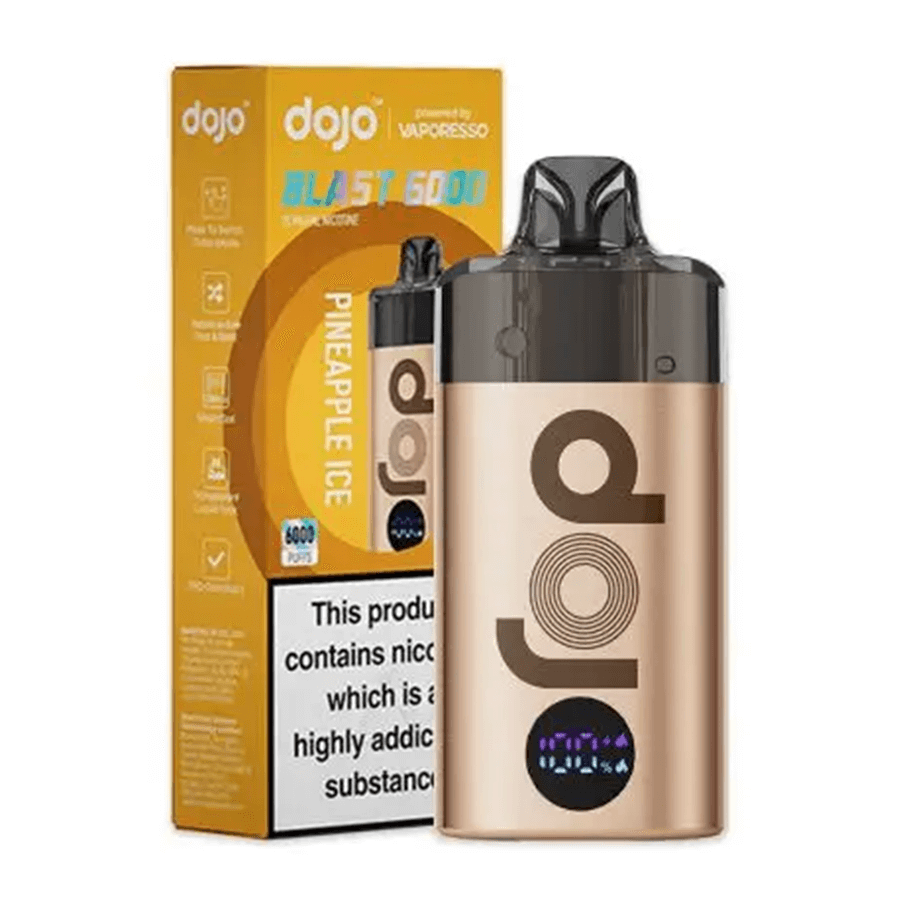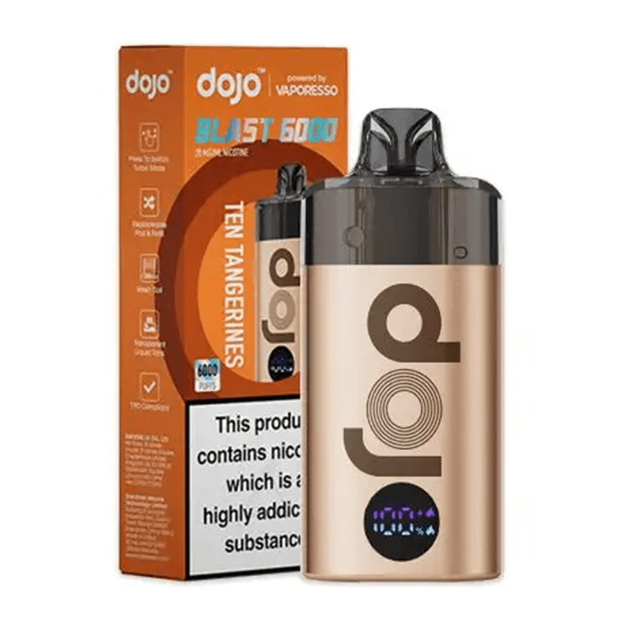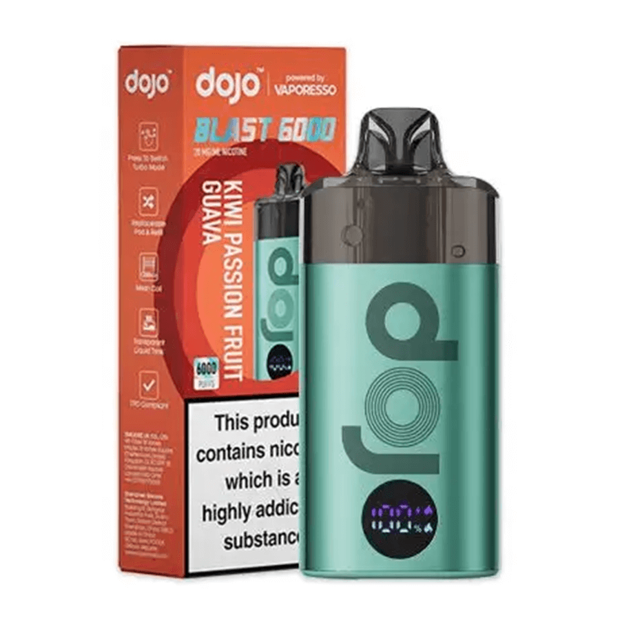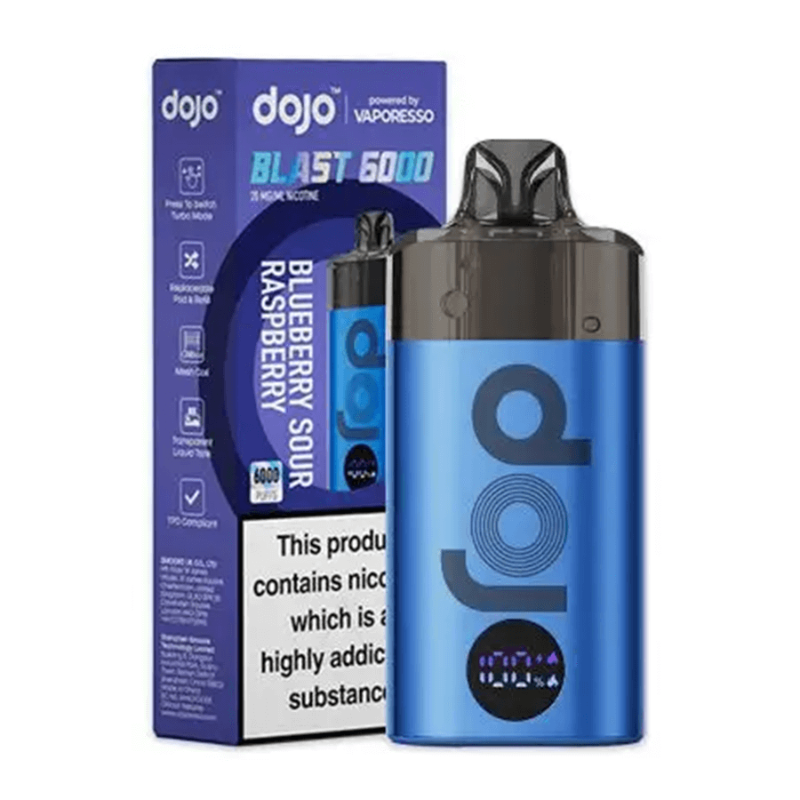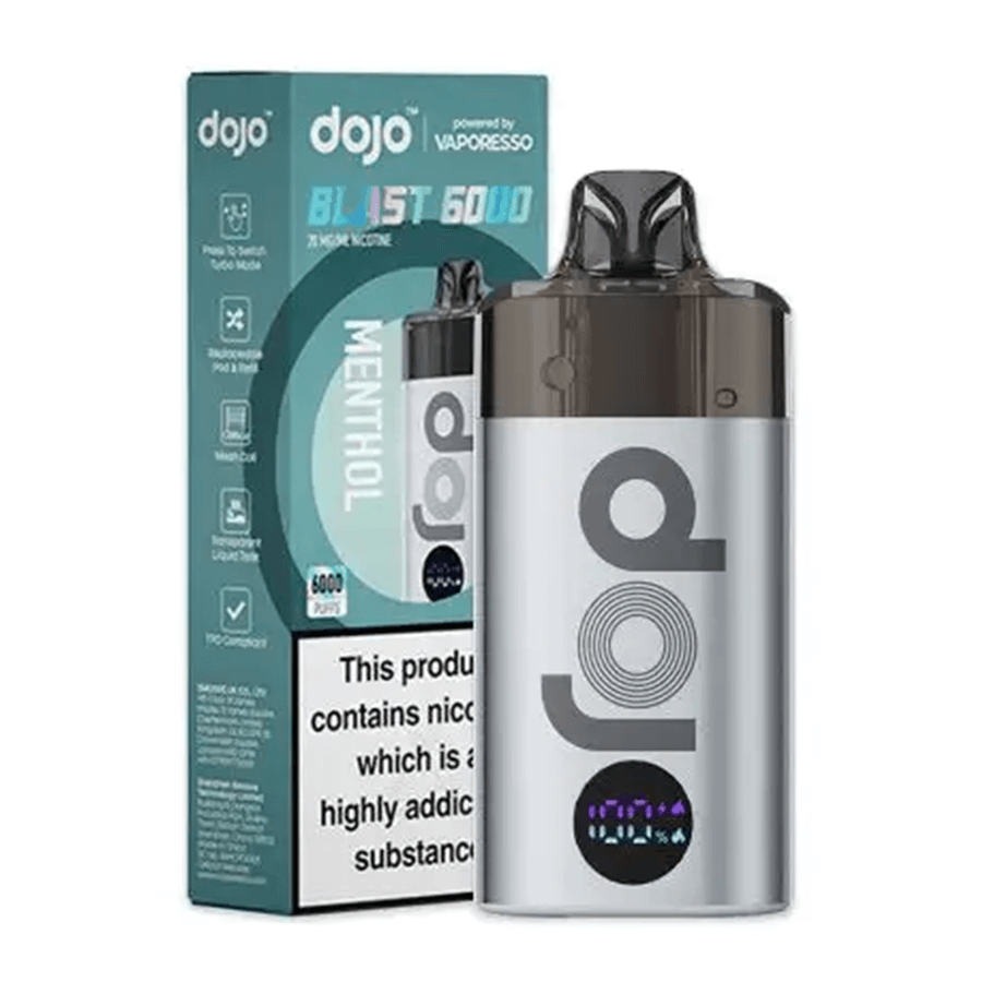 The Vaporesso Dojo Blast 6000 is a TPD-compliant rechargeable and replaceable big puff vape which features a 650mAh battery and prefilled pod for up to 6000 puffs.
