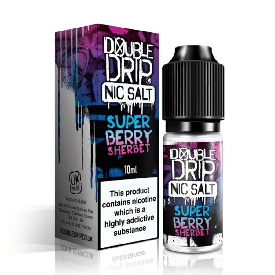 Double Drip Super Berry Sherbet contains nicotine salts, which help you overcome cravings quicker because they are absorbed into the bloodstream faster. Additionally, because nic salts provide a much softer throat hit, you can use higher nicotine doses without experiencing a harsh throat hit.