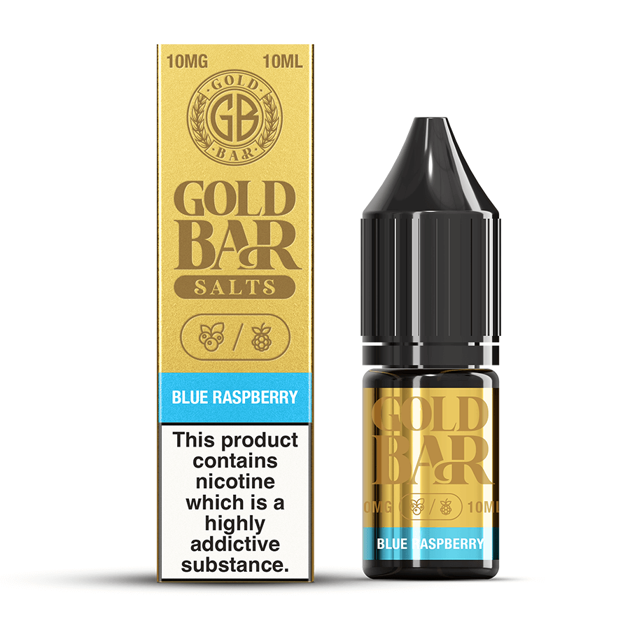 Blue Raspberry flavour nicotine salt e-liquid. This is the official e-liquid from Vape Gold, the company that brought you the Gold Bar 600 disposable vape. You can now recreate the flavour of the distinctive gold disposable with any refillable pod vape kit.
