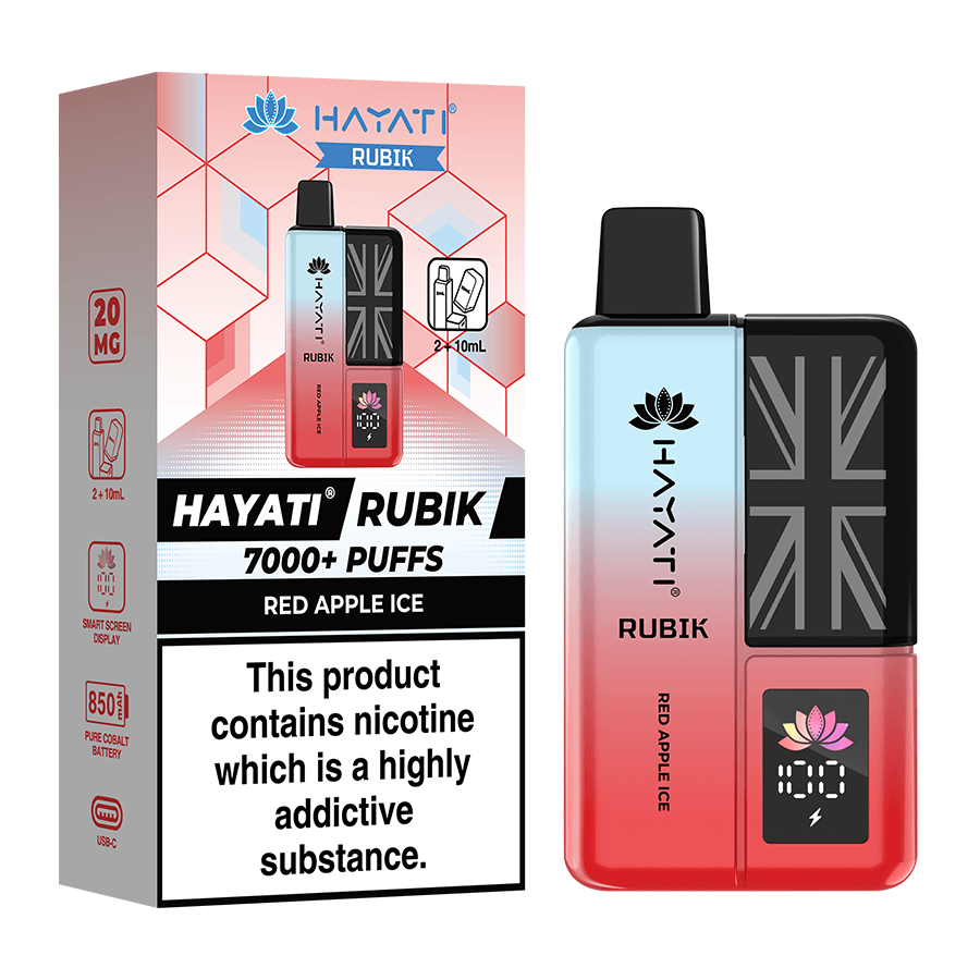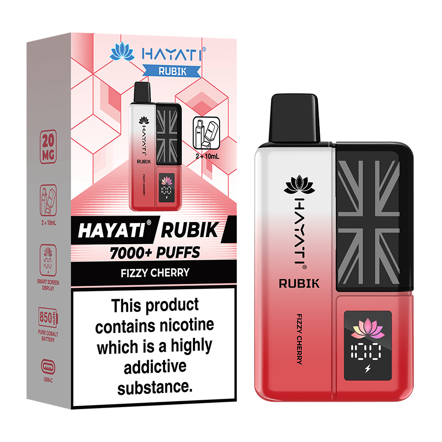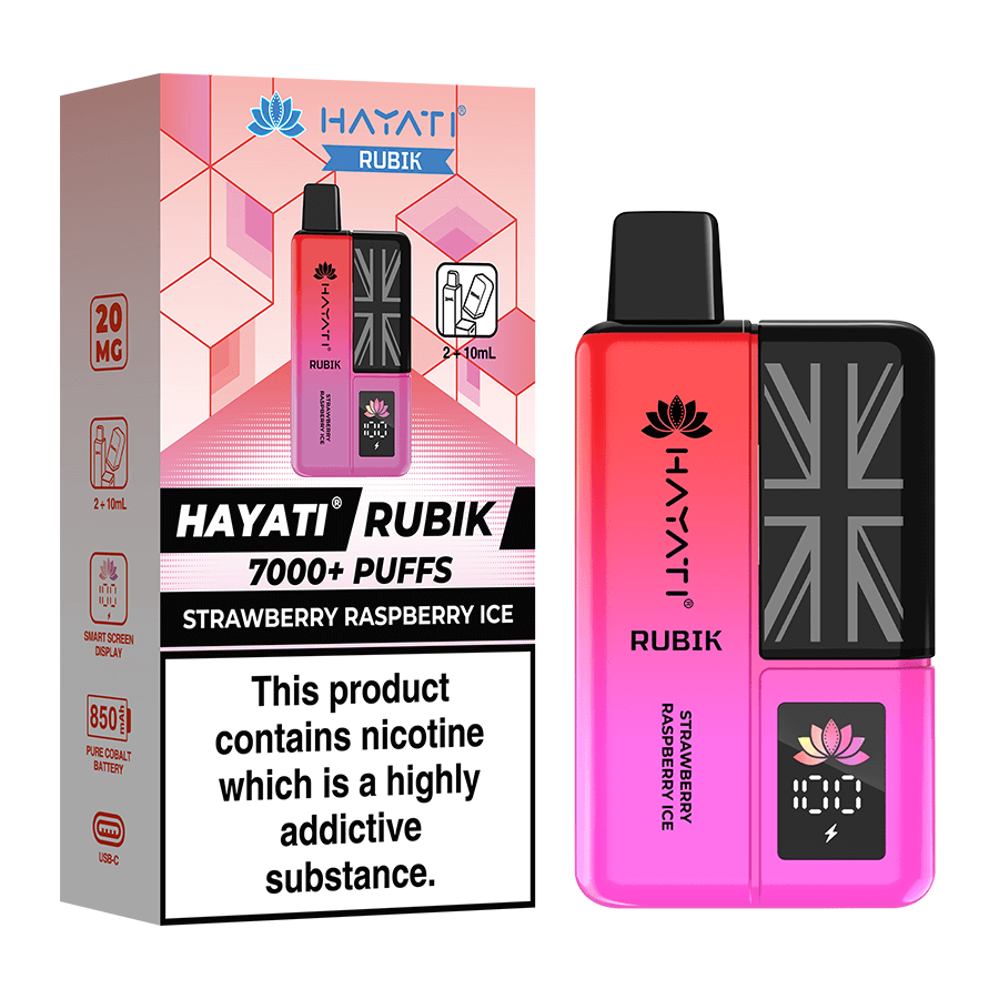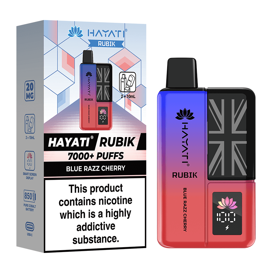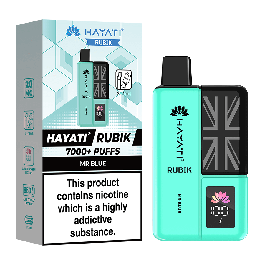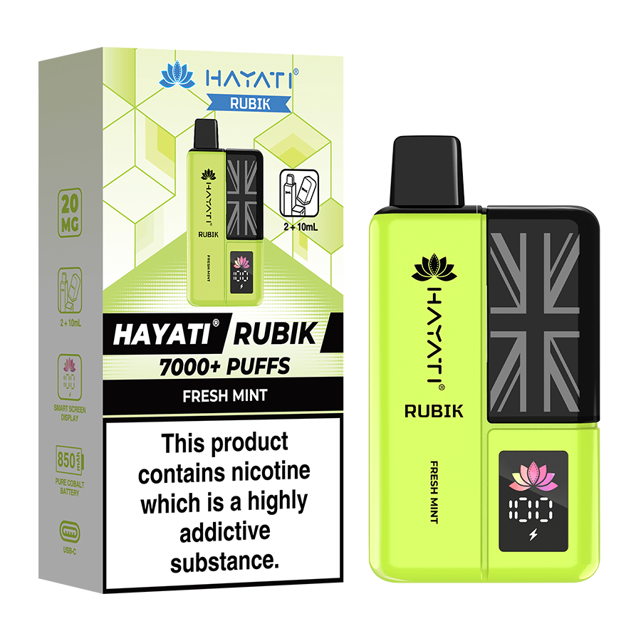The Hayati Rubik is a big puff prefilled vape capable of providing up to 7000 puffs of vapour. The Rubik is filled with a combined 12ml of nicotine salt e-liquid and is available in 20 delicious Hayati flavours in 20mg (2%) nicotine strength. The device is fitted with a powerful 850mAh battery, battery display screen and fast charge USB-C charge port. This pocket-friendly vape delivers delicious AND robust flavour in an easy-to-use and intuitive format.