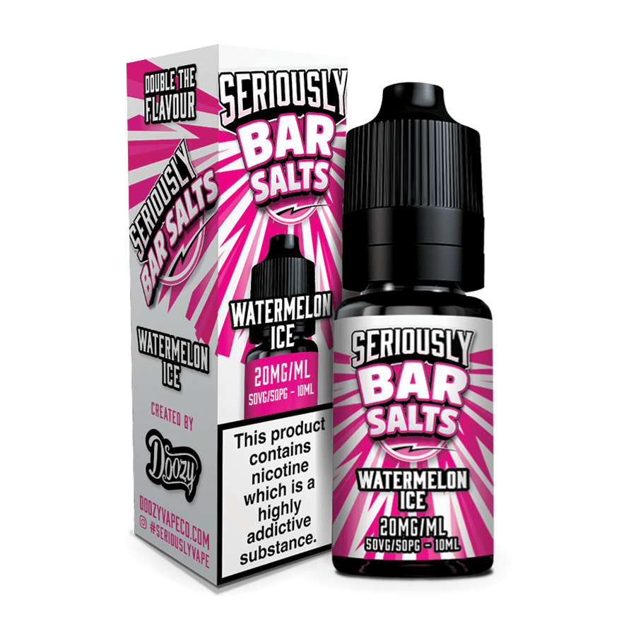 Watermelon Ice Seriously Bar Salts is a nicotine salt e-liquid available in 5mg, 10mg and 20mg. Nicotine salts are the type of e-liquid found in most prefilled vape kits and provide a smooth inhale experience, even at higher nicotine strengths. Nic salts also curb cravings much faster than traditional freebase nicotine as they are absorbed into the body much more quickly.